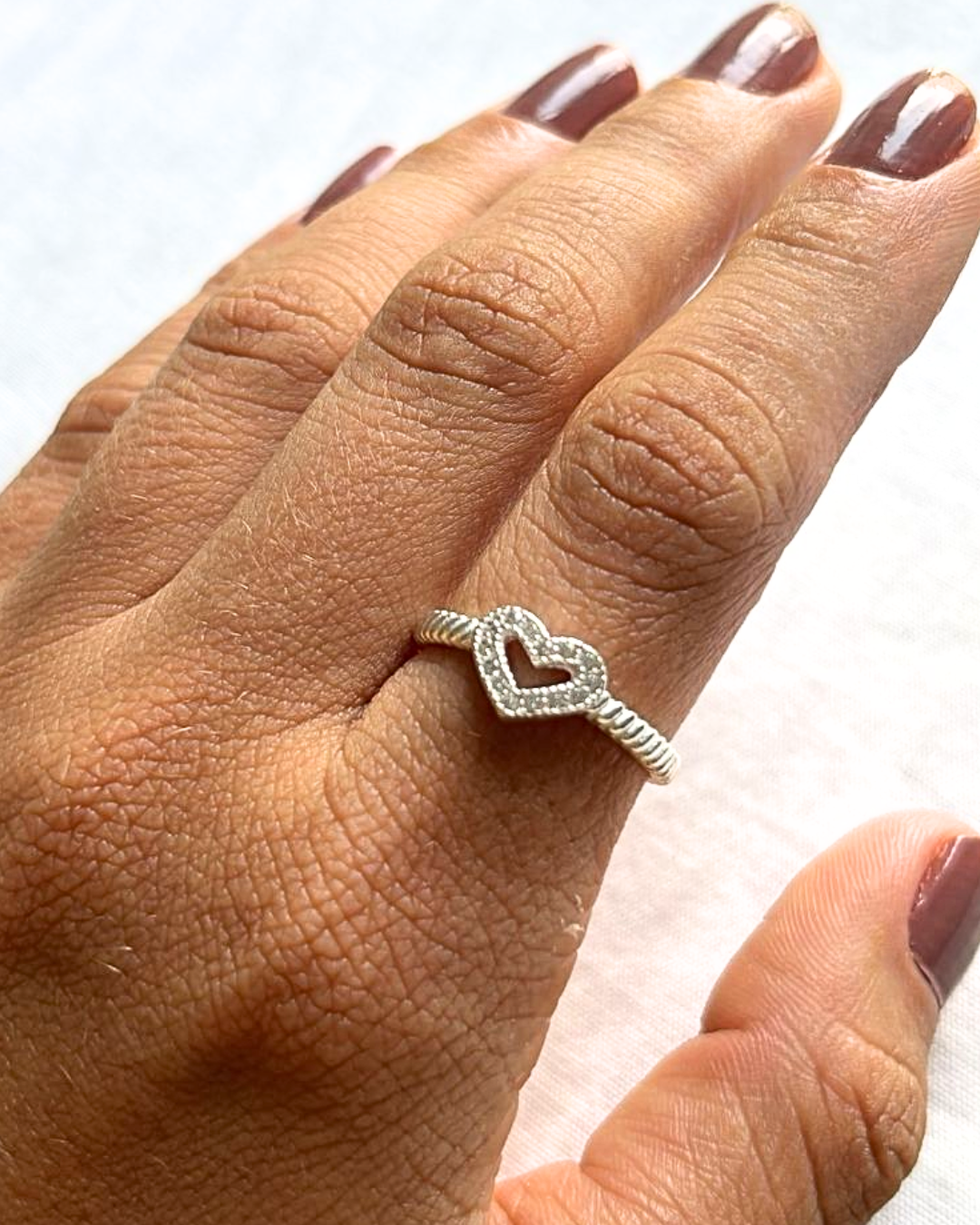 - Modelo: Anel Coração Vazado cravejado com Zircônia e Textura no Aro
