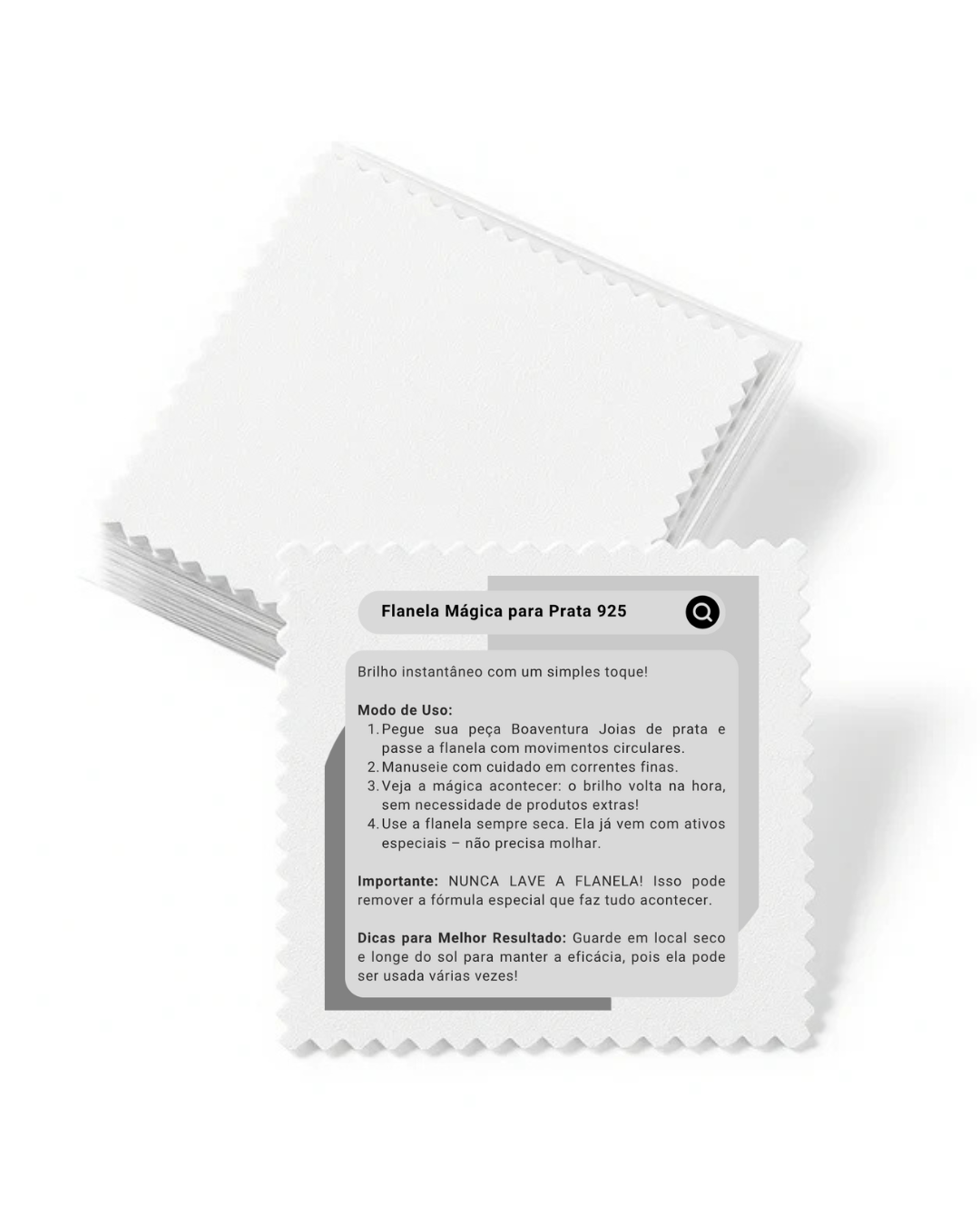 Além disso, cada compra é presenteada com uma Flanela Mágica de Limpeza, especialmente desenvolvida para manter o brilho e a beleza da sua joia por muito mais tempo.